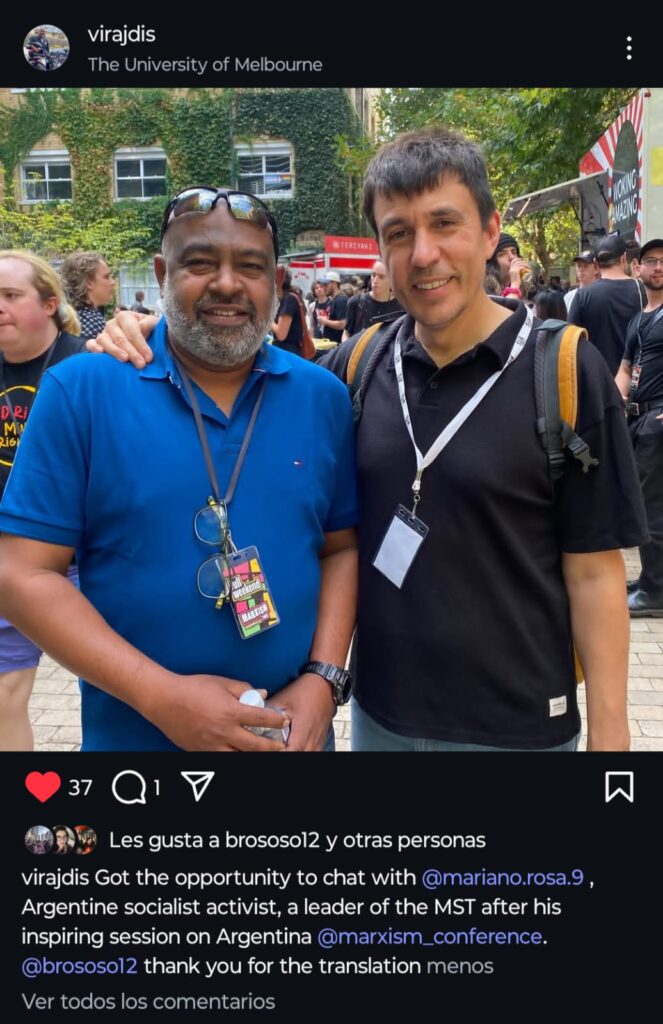 Finally, we highlight the decisive role of the International Socialist League as support to the orientation of its Argentine section, for the understanding of the Milei phenomenon in the light of world tendencies, as well as for the left to turn into a pole of real reference with mass influence for the dispute of power and a workers’ government in transition to socialism. We presented the tasks of the Argentine party, the MST in the FIT-Unity, as part of the international struggle of the ISL to regroup the revolutionaries of the world in a project on principled bases and a program for the revolution, bringing together different revolutionary traditions which, through a healthy functioning of coexistence of the different revolutionary traditions, will be a real reference pole for the struggle for power and a government of the workers in the transition to socialism, through a healthy functioning of centralized coordination for the realization of militant campaigns, internationalist support and the formation of new leaders, places special emphasis on the internal democracy of the organization, overcoming all the disastrous experiences of the past, bureaucratic and single-minded in the international construction. The strategy of converging the best of each revolutionary identity in a new synthesis for the XXI century as a mark of the ISL, was received with special interest by the participants of the conference that we headed and in each of the multiple panels to which we were invited, as well as in the after hour with delegations from Sydney, Brisbane and other regions of Australia.
