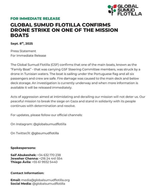 The boat where Greta Thunberg, Thiago, Saif and part of the Board of Directors of the Global Sumud Flotilla (GSF) are sailing, was hit by a drone attack in international waters. According to the GSF official statement, one of the main vessels, the Family Boat, sailing under the Portuguese flag “suffered fire damage to the main deck and below deck storage area” after being bombed by a drone.