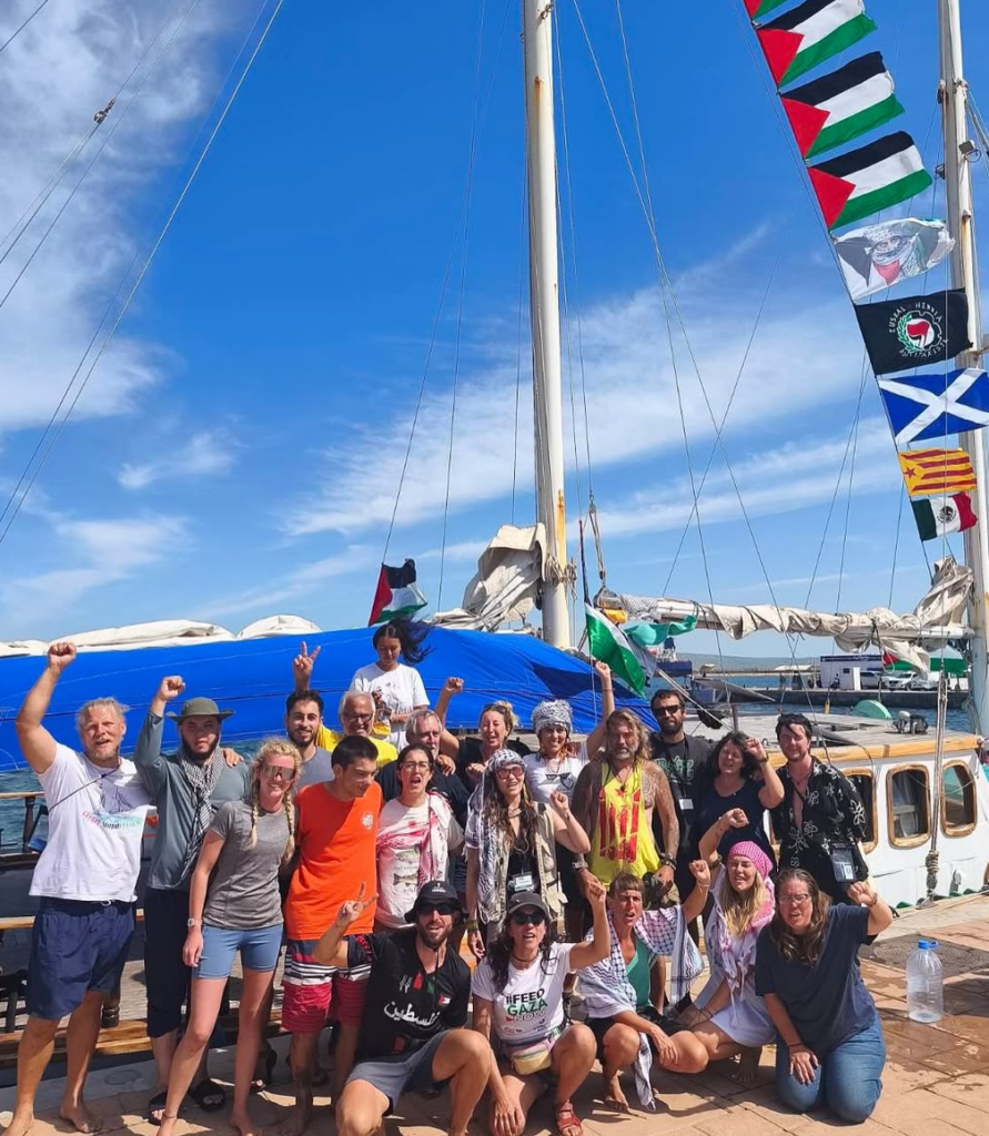 With the flotilla at sea and with those mobilizing on land, let’s shout: Stop genocide in Palestine! Let’s break the blockade to humanitarian aid! Let’s protect the flotilla!