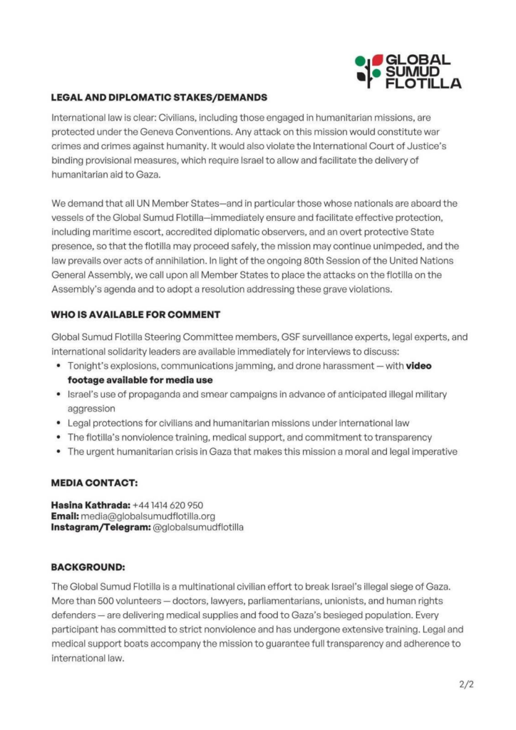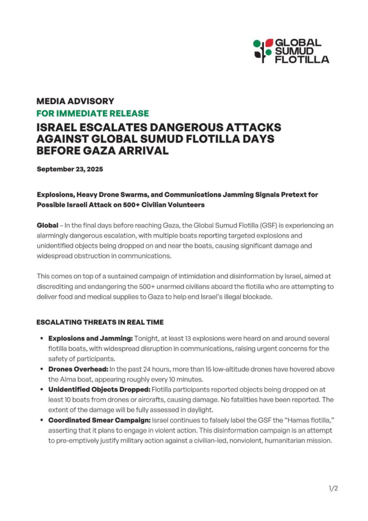 The Global Sumud Flotilla (GSF) is moving towards its decisive stage. In the midst of the Zionist offensive on Gaza, a devastating famine and enduring intimidation, it reaffirms its will to break the blockade on humanitarian aid.
