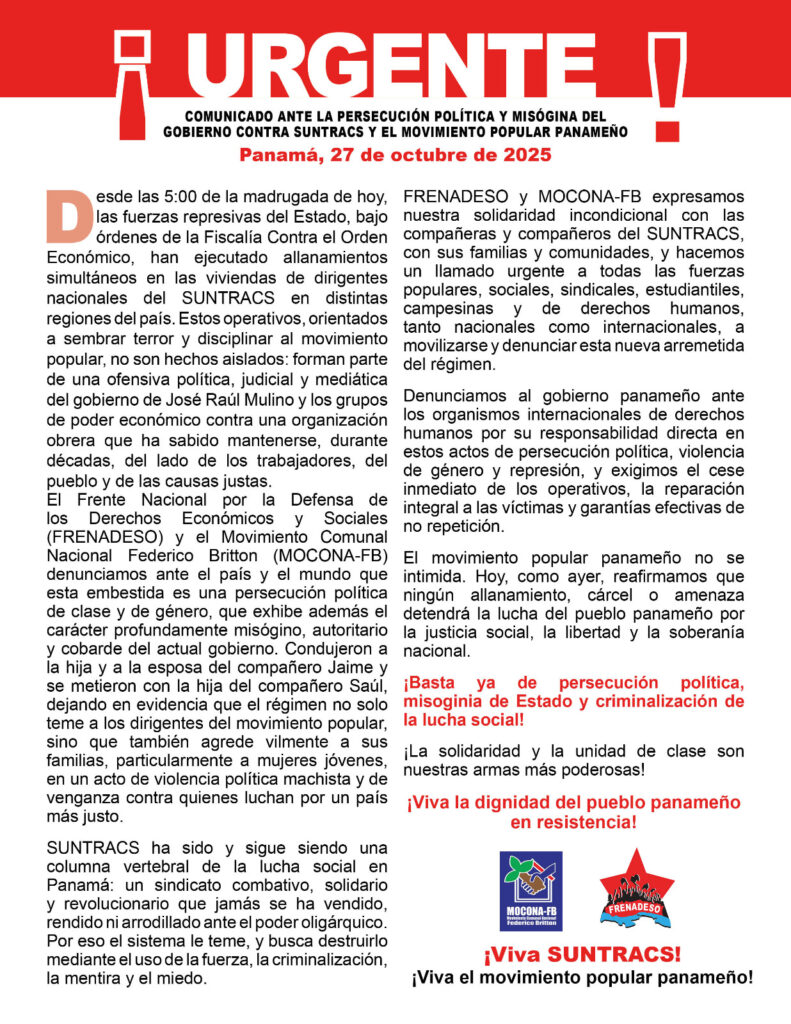 As supporters of the International Socialist League, we raise our voice of indignation at the repression unleashed by the dictatorial regime of Mulino against the leadership, their families and the workers organized in SUNTRACS. The arbitrary detention of comrades, the criminalization of protest and the political-judicial persecution constitute a direct attack on the democratic freedoms won by the Panamanian people through years of struggle. We demand the immediate and unconditional release of all those arrested, the cessation of repression and respect for the right to workers’ organization and mobilization.
