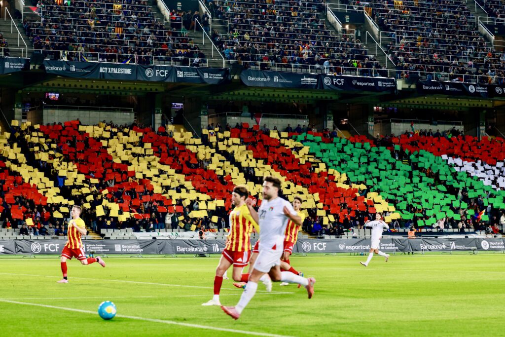 Solidarity match between the Palestine and Catalonia national soccer teams , at the Montjuic Olympic Stadium.