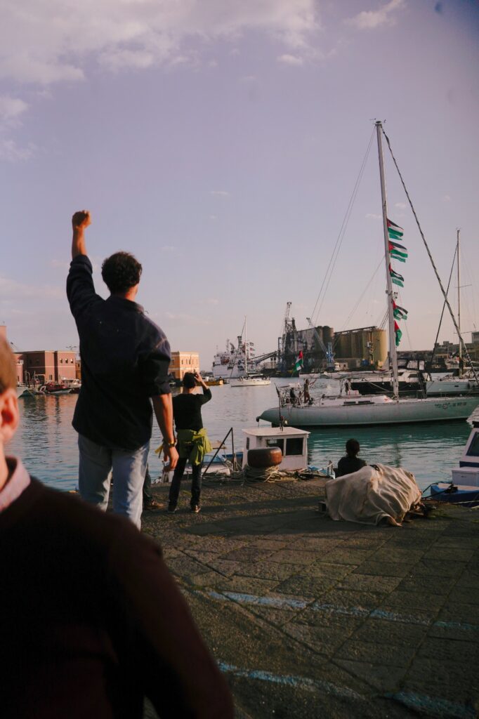 Numerous organizations were represented, including the Unione Sindacale di Base (USB), which has already organized several strikes in solidarity with Palestine. From that teachers’ union Claudia Orsi told us a few words: “My union organized and led the strikes of September 22, October 3 and November 28, 2025, in protest against the genocide in Palestine, a fellow dockworker from Genoa was on board and we provided great support. Those were really important moments in Catania where we had the Piazza Gaza, which was our Piazza Stesicoro, which was filled every day and every night with hundreds of people in spontaneous marches. So we hope we can continue because this is perhaps the most difficult moment for Gaza and for Palestine, because of the public opinion, they think there is a ceasefire, but there is not, people are still dying in Gaza, there is no electricity, no basic necessities, no medicine, no press and no drinking water…So now we also support this Flotilla and we hope it can arrive”.