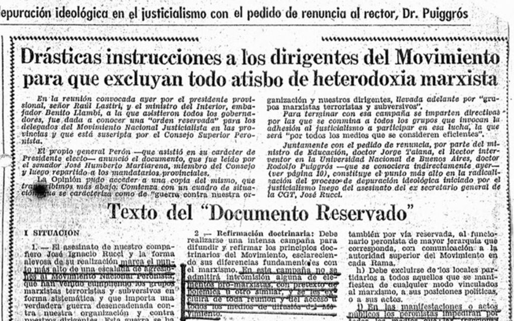 Con fecha del 1 de octubre de 1973 el Consejo Superior Peronista define la situación política del momento como una guerra, y plantea la necesidad de impulsar una limpieza de la supuesta infiltración marxista en el movimiento justicialista: “El asesinato de nuestro compañero José Ignacio Rucci (…) marca el punto más alto de una escalada de agresiones al Movimiento Nacional Peronista (…) que han venido cumpliendo los grupos marxistas terroristas y subversivos (…) que importa una verdadera guerra desencadenada contra nuestra organización”[5].