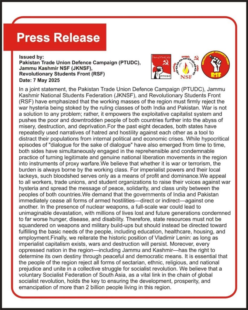 Dans une déclaration conjointe, la Campagne de Défense Syndicale du Pakistan (PTUDC), la Fédération Nationale des Étudiants du Jammu-et-Cachemire (JKNSF) et le Front des Étudiants Révolutionnaires (RSF) ont souligné que les masses laborieuses de la région doivent rejeter fermement l’hystérie guerrière attisée par les classes dirigeantes aussi bien en Inde qu’au Pakistan. La guerre n’est une solution à aucun problème ; au contraire, elle renforce le système capitaliste d’exploitation et pousse les pauvres et les opprimé·e·s des deux pays dans l’abîme de la misère, de la destruction et de la précarité.