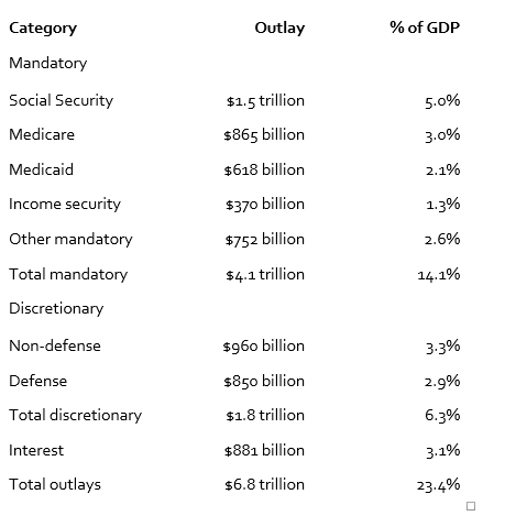 La sécurité sociale est le principal système public de retraite. Medicare est le principal système public d’assurance maladie pour les retraités. Medicaid est le principal système public d’assurance maladie sous condition de ressources. La sécurité du revenu comprend l’indemnisation du chômage, le revenu d’invalidité, le soutien aux enfants et à la famille et l’aide alimentaire. Les « autres dépenses obligatoires » comprennent principalement la retraite des civils et des militaires fédéraux et les avantages sociaux des anciens combattants.