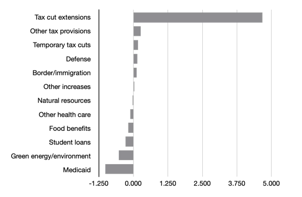 Le CBO a élaboré un rapport détaillé intitulé « Estimated Budgetary Effects of an Amendment in the Nature of a Substitute to H.R. 1, the One Big Beautiful Bill Act, Relative to CBO’s January 2025 Baseline » (Effets budgétaires estimés d’un amendement de substitution à la loi H.R. 1, intitulée « One Big Beautiful Bill Act », par rapport à la base de référence de janvier 2025 du CBO). Alicia Parlapiano, Margot Sanger-Katz, Aatish Bhatia et Josh Katz, du New York Times, ont analysé ce rapport dans un article intitulé « A List of Almost Everything in the G.O.P. Bill, and How Much It Would Cost or Save » (Une liste de presque tout ce que comprend l’OBBBA et combien cela coûterait ou permettrait d’économiser). Le graphique suivant est tiré de leur analyse.