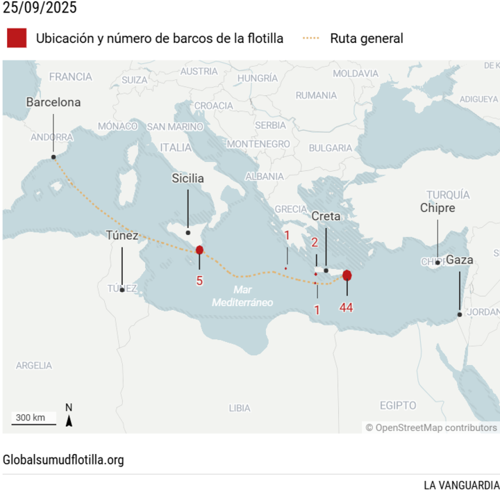 Allo stesso tempo, il governo spagnolo ha annunciato che la nave d’azione marittima (BAM) “Furor” lascerà oggi il porto di Cartagena con “52 soldati e otto medici per fornire assistenza ai cittadini spagnoli e belgi”. Sia questa mossa che quella della nave italiana, anch’essa annunciata come supporto, sono più simboliche che di effettiva protezione. Vale la pena notare che l’UE nel suo complesso non ha adottato misure concrete per garantire la libera circolazione della GSF nel Mediterraneo, né per indagare e fermare i droni che la molestano.