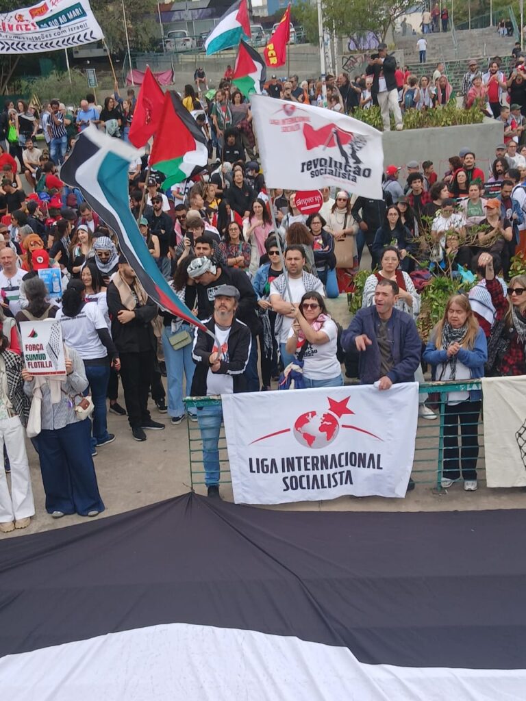 Desde a LIS, também apelamos à multiplicação das ações de exigência aos governos para que protejam efetivamente a Flotilha contra as ameaças e agressões do Estado de Israel e seus cúmplices e para que se repitam os exemplos dos trabalhadores da Catalunha e da Itália, que avisaram que, se tocarem em alguém da GSF, haverá interrupção do comércio e greves.